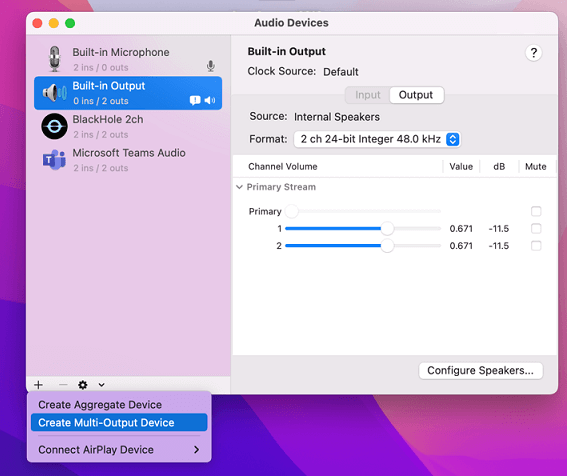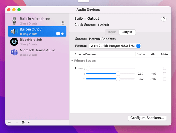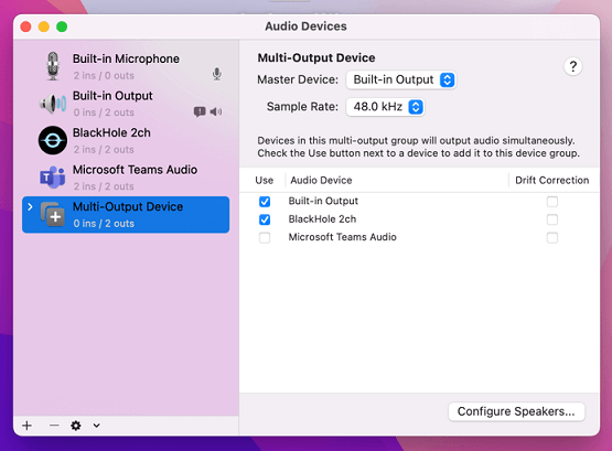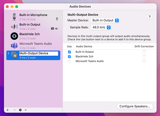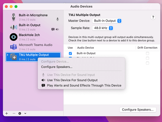 6. On right side deselect the checkbox next to the audio output device you are currently using, then select Blackhole 2ch, then the audio output device you deselected.