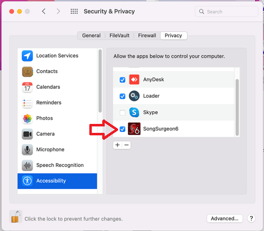 3. The following window will open as shown below. On the left-hand side select Accessibility. On the right-hand side, you may or may not see Song Surgeon 6. If you do, make sure it is checked. If it is not, click the padlock at the bottom left to unlock this window and then check the box next to Song Surgeon