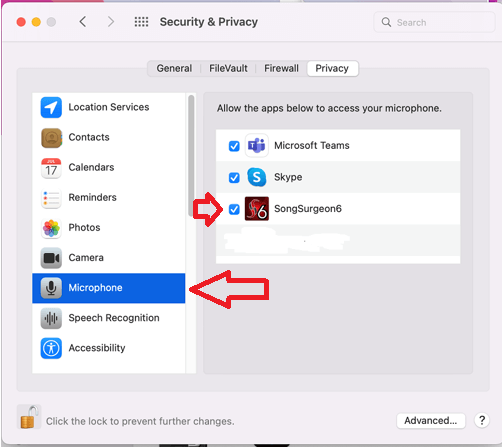 4. Next, in this same screen find and select “Microphone” on the left. When you do, on the right-hand window should see Song Surgeon. Again, it MUST be checked so, unlock the screen and check it, if it is not.